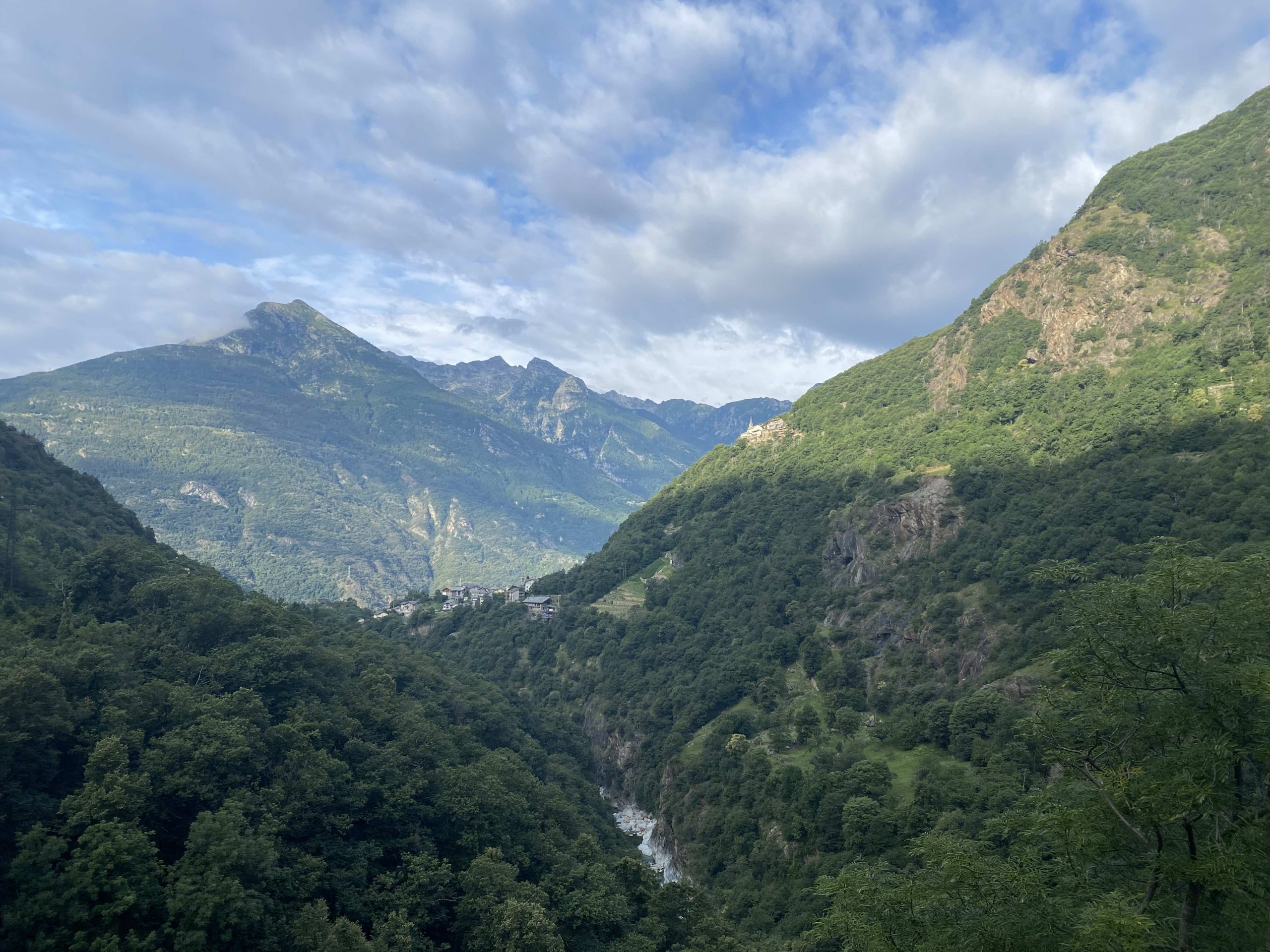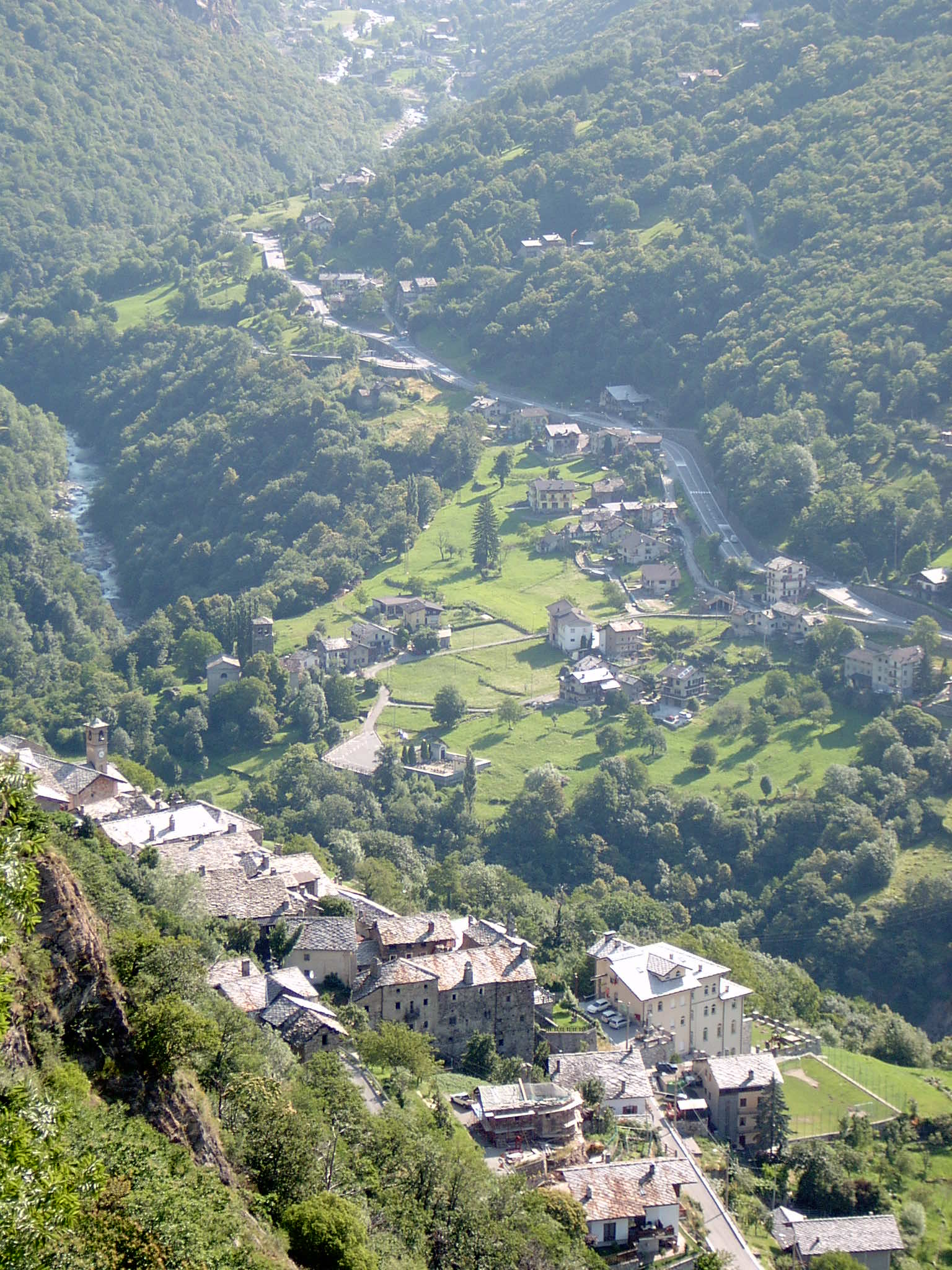 The village of Perloz is characterized by two imposing castles and a central road that winds between two rows of houses.